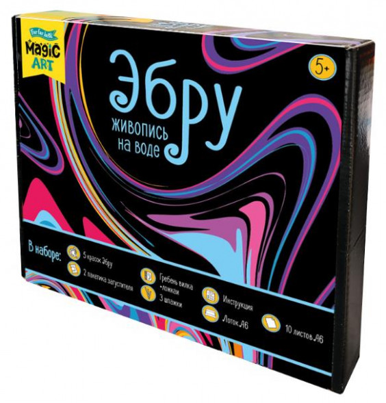 Набор для рисования на воде "Эбру" серия "Magic ART" (Лоток А6) Состав набора: пластиковый лоток (20,5 х 14,5 см), гребень-вилка (длина 8 см), шпажки для рисования - 3 шт. (16 см), листы бумаги для переноса рисунка формата А6 - 10 шт. (14,8 х 10,5 см), порошок-загуститель - 2 уп., краски (синий, красный, оранжевый, зелёный, жёлтый) - 5 шт., инструкция. Материалы: полимерный материал, бумага. Для детей старше 5 лет.