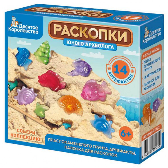 Раскопки "Юного археолога" (14 артефактов) Состав игры: Пласт грунта (гипс); Деревянный стек - 1 шт; Фигурки из пластика - 14 шт. Материалы: гипс, полимерный материал, дерево. Рекомендуется для детей старше 6 лет.