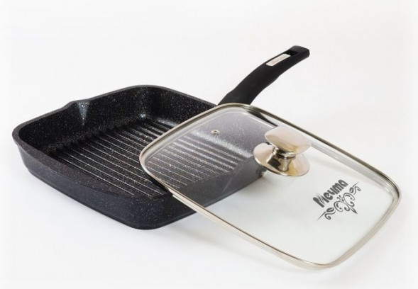 Сковорода-гриль квадр. 28*28 см с антипригарным покрытием, несъемной ручкой и стеклянной крышкой серии "Гранит star". Подходит для всех типов плит, кроме индукционных. Можно использовать в посудомоечной машине.